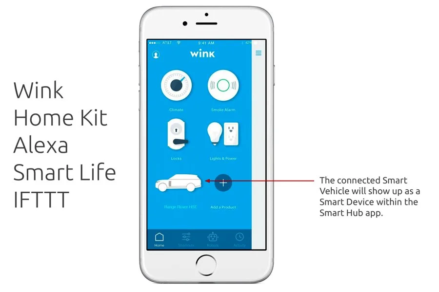 Design a feature allowing a connected vehicle to become a node within a Smart Device ecosystem, and control home Smart Devices utilizing vehicle status and location.